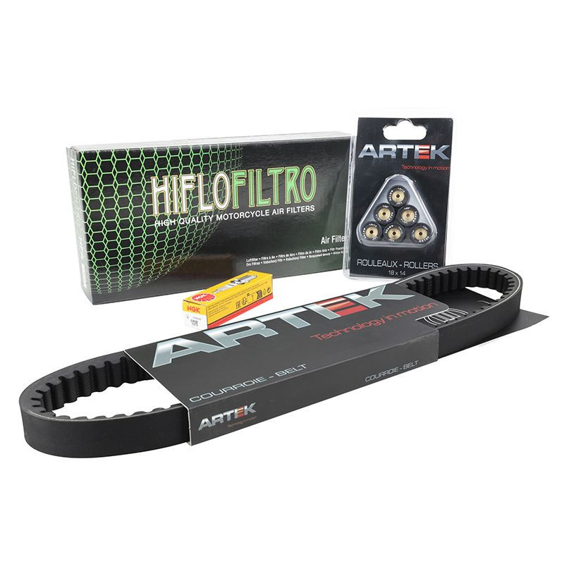 Ce kit entretien est composé : Bougie NGK CR8E (ref P2R : 4078) Filtre à air Hiflofiltro HFA5102 (ref P2R : 152237) Galet Artek 18x14 (14 gr) (Ref ...