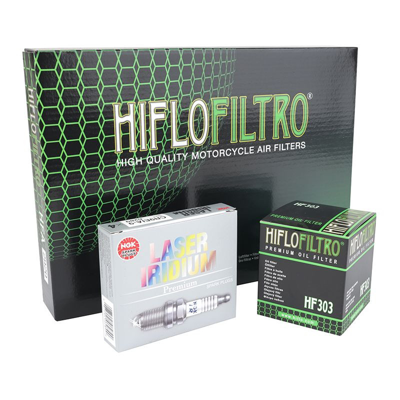 Ce kit entretien est composé : Bougie NGK CR9EIA-9 (x4) (ref P2R : 21740) Filtre à huile HIFLOFILTRO HF303 (ref P2R : 37154) Filtre à air HIFLOFILT...