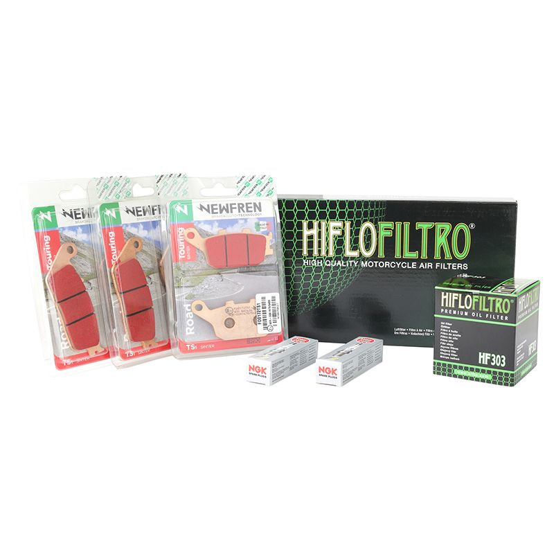 Ce kit entretien est composé : Bougie NGK CR9EIA-9 (x2) (ref P2R : 21740) Filtre à huile HIFLOFILTRO HF303 (ref P2R : 37154) Filtre à air HIFLOFILT...