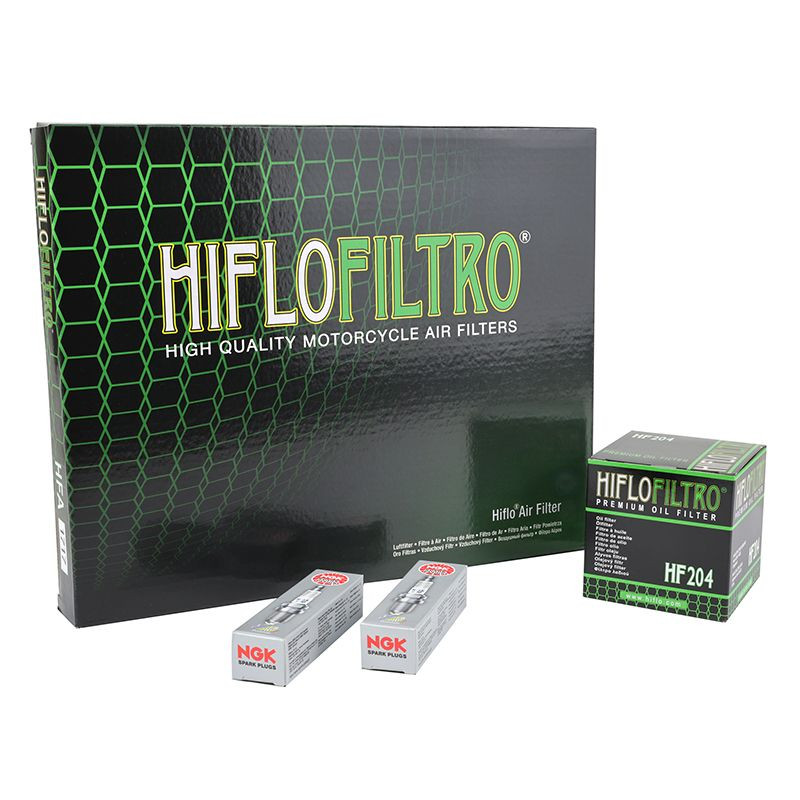 Ce kit entretien est composé : Bougie NGK IFR6G-11K (x2) (ref P2R : 36922) Filtre à huile HIFLOFILTRO HF204 (ref P2R : 37174) Filtre à air HIFLOFIL...