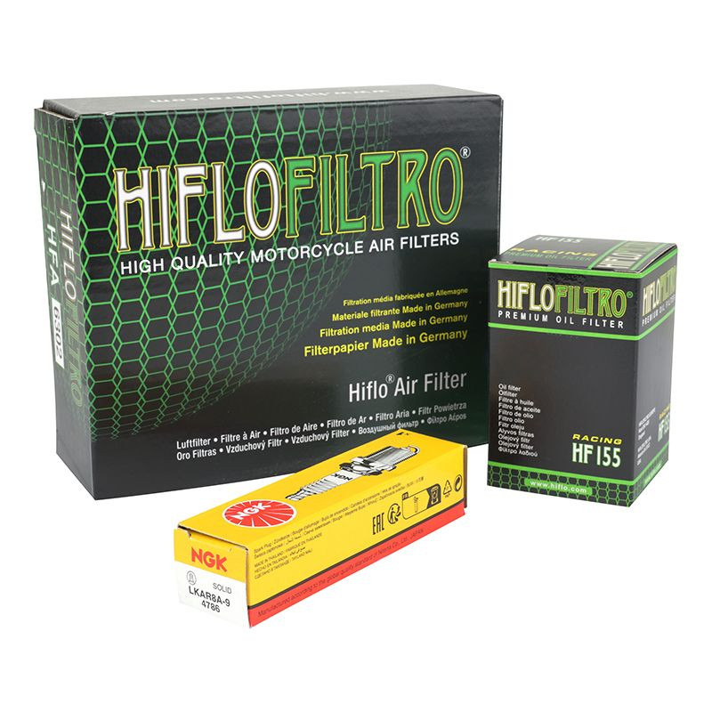 Ce kit entretien est composé : Bougie NGK LKAR8A-9 (ref P2R : 136016) Filtre à huile HIFLOFILTRO HF155 (ref P2R : 37203) Filtre à air HIFLOFILTRO H...