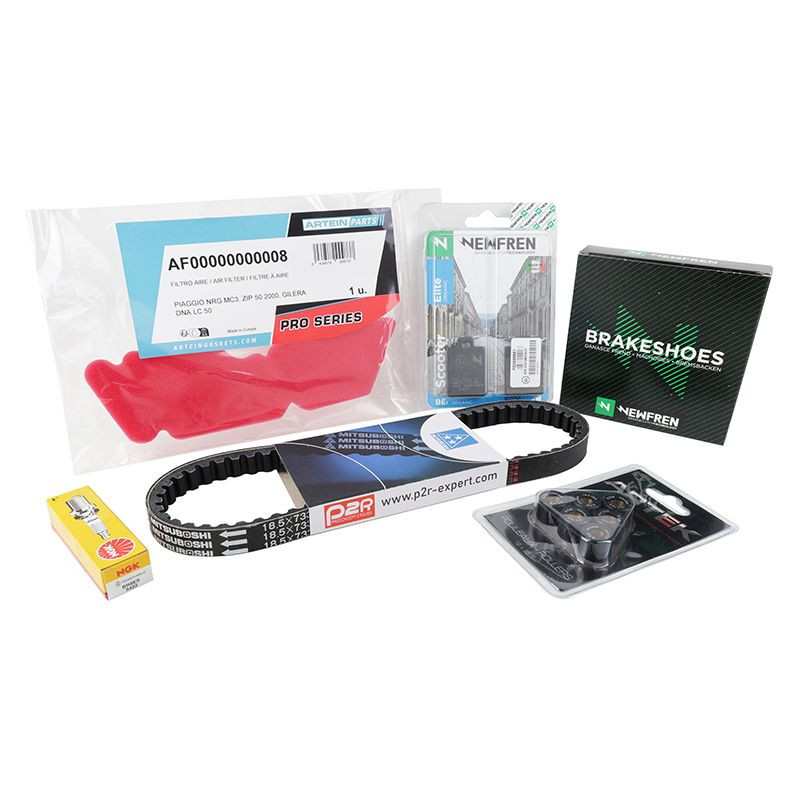 Ce kit entretien est composé : Bougie NGK BR8ES (ref P2R : 4055) Mousse de filtre à air Artein (ref P2R : 31296) Galet Artek 19x15,5 (6,5 gr) (ref ...